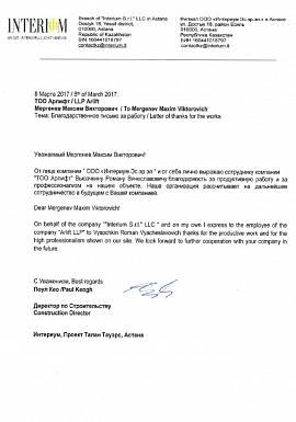 Благодарственное письмо от ТОО "Индустриальная компания"